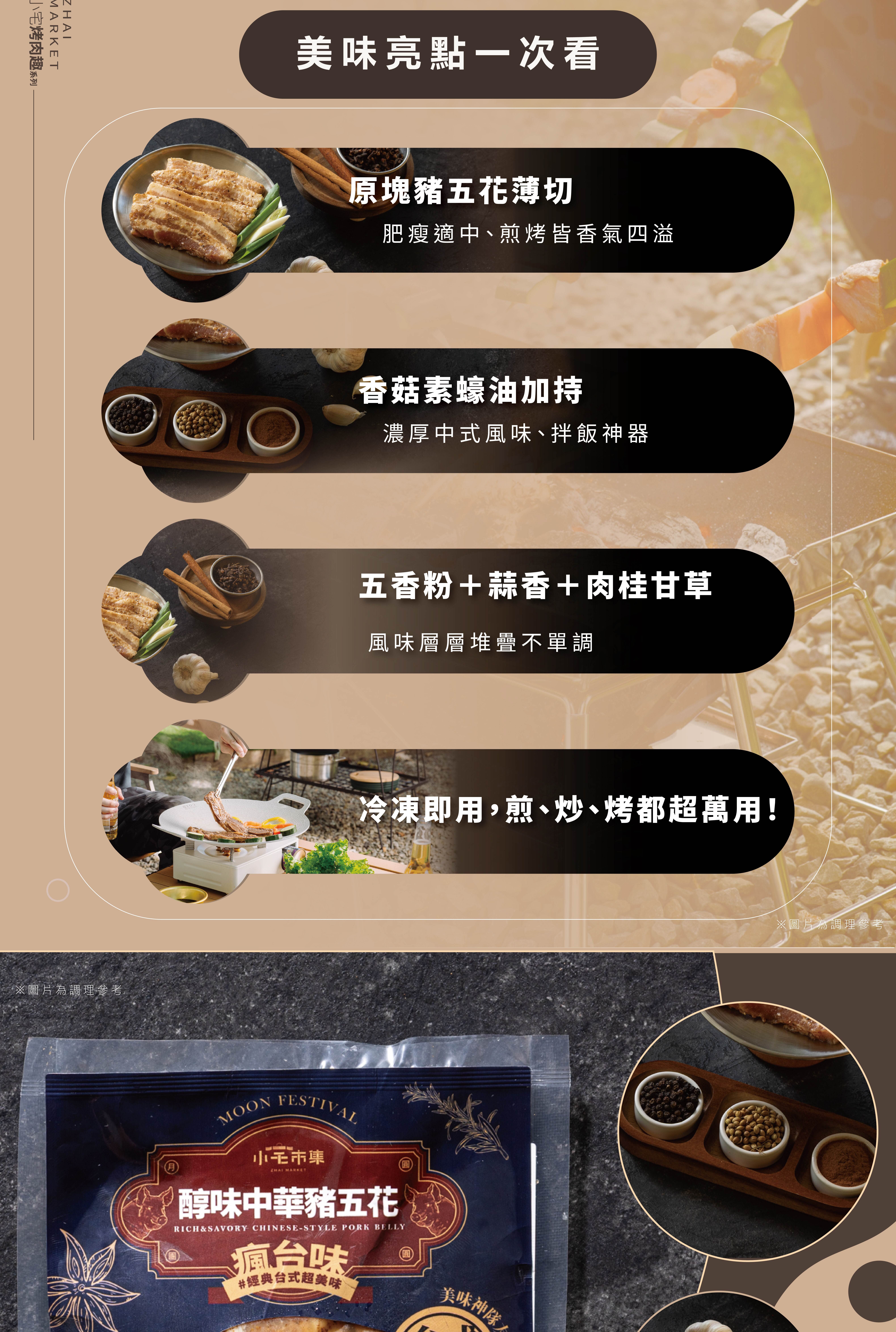 選用嚴選豬五花,結合中式經典「五香+香菇素蠔油」獨門配方醃製,這款「醇味中華豬五花」完美展現中華料理的層次感與香氣爆發力。滑嫩油脂包裹醬香,每一口都像滷味攤升級重製版!