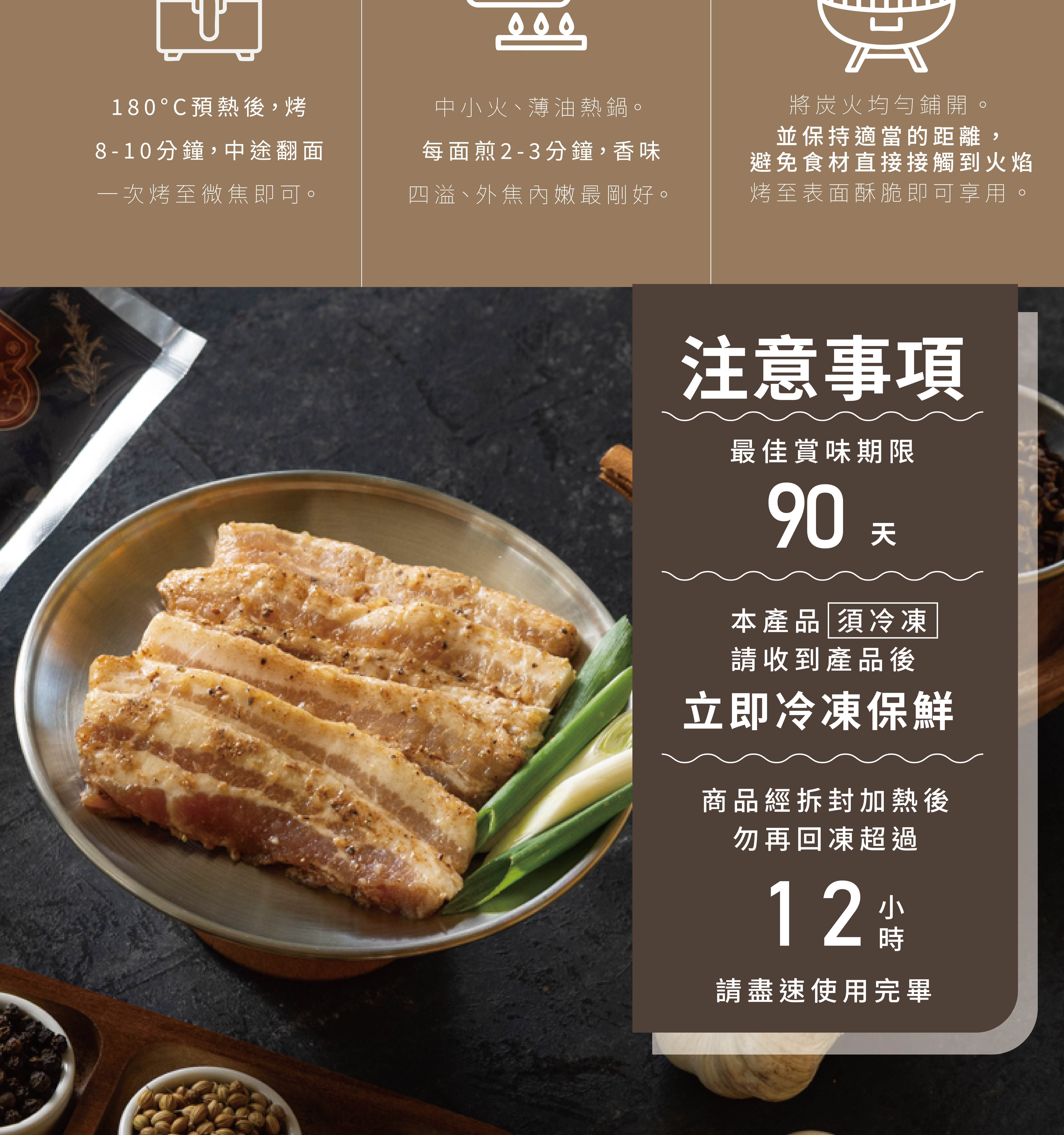 烹調方式:將解凍後的料理肉品拆封,加熱烤至焦香酥脆即可食用