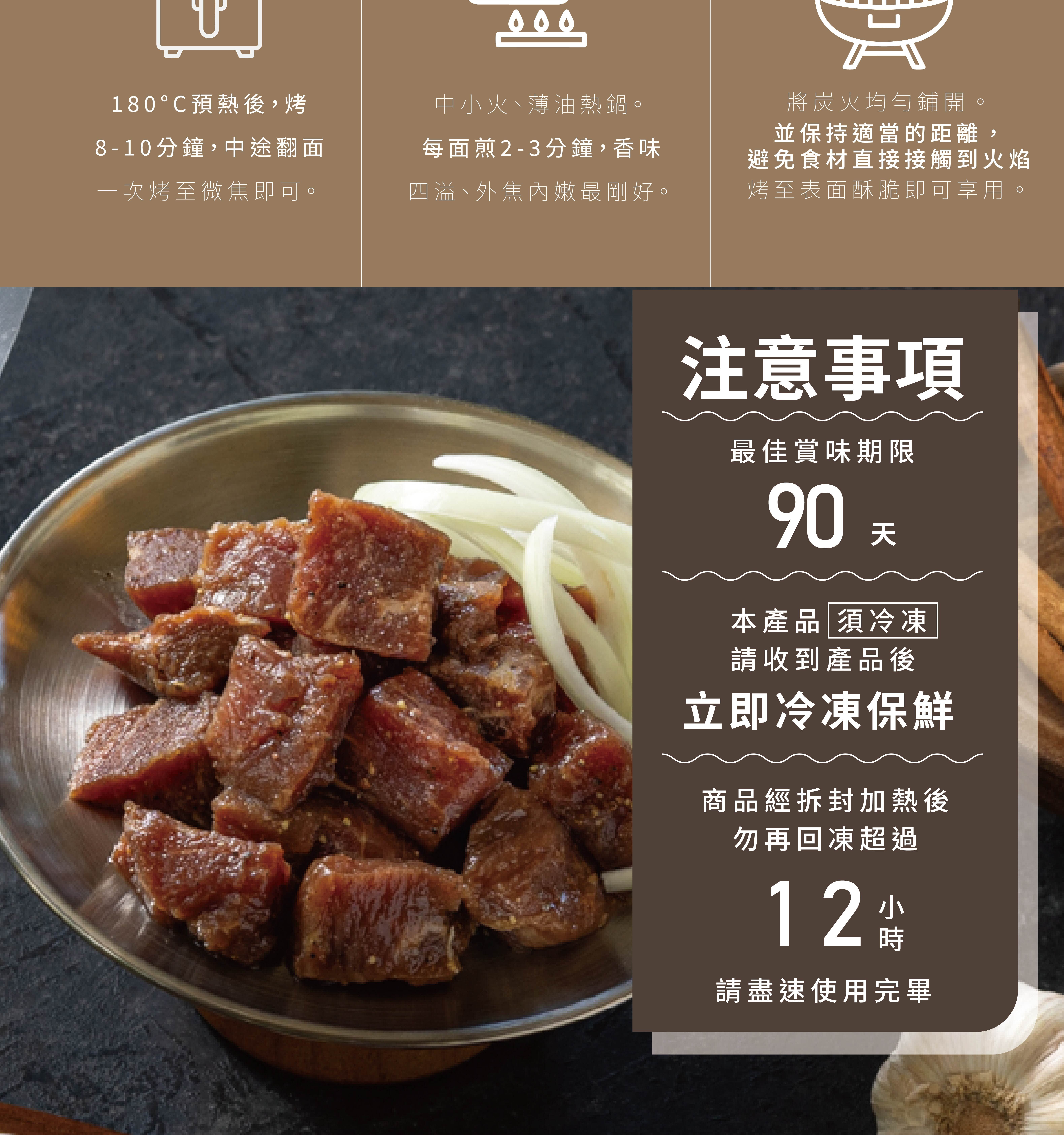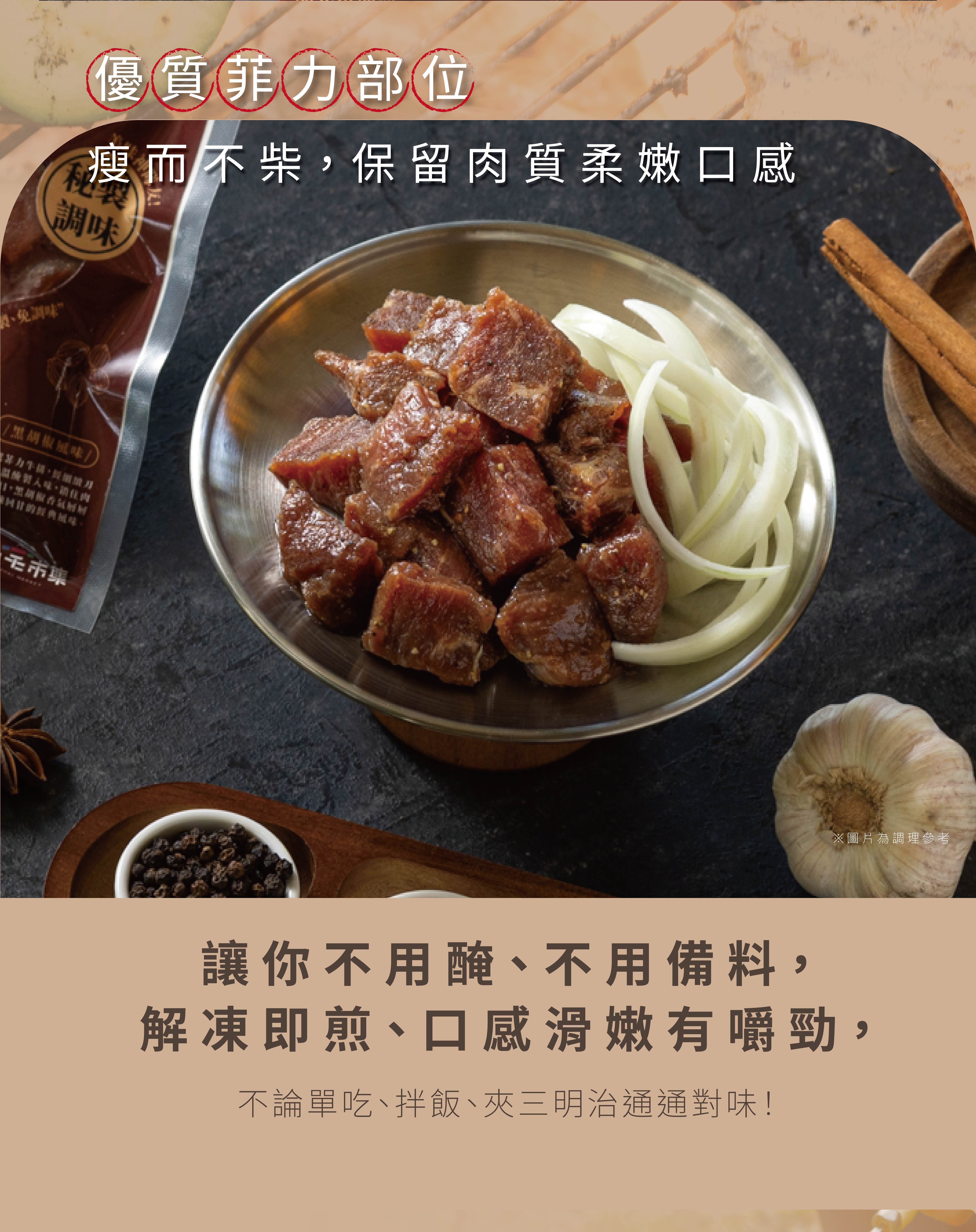 選用優質牛肉部位,搭配黃金比例的手工醃製,這款「嫩醃菲力牛」以醬油、蒜粉、洋蔥粉與五香調和出柔順甘醇的牛肉風味,讓你不用醃、不用備料,解凍即煎、口感滑嫩有嚼勁,不論單吃、拌飯、夾三明治通通對味!