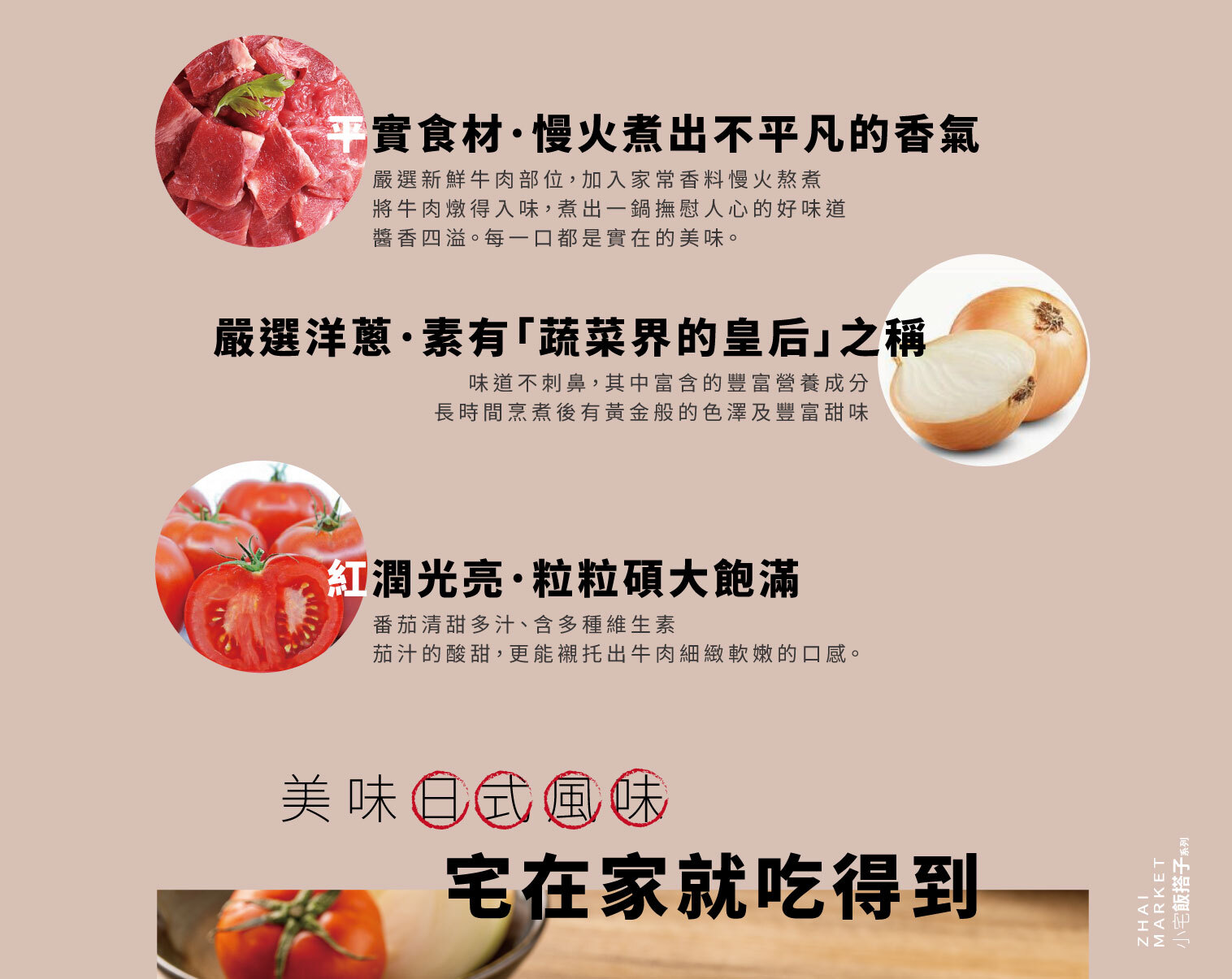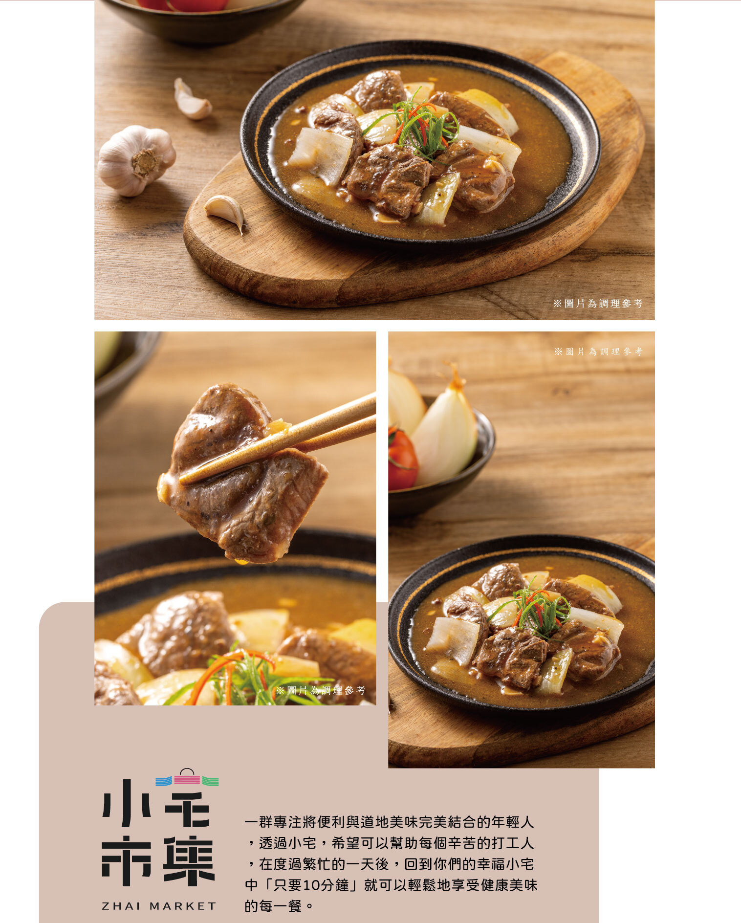 | 小宅市集-提供給你即熱即食;家常美味【冷凍保存便利加倍】 想找一道簡單加熱就能上桌的家常料理嗎?小宅市集嚴選【冷凍菜餚】系列 — 這款田園洋蔥燉牛肉,使用台灣在地甜洋蔥跟嫩牛肉,由五星主廚監製;完美熬煮而成的經典日式風味,香甜不膩,鹹香下飯!是你冰箱不可或缺的冷凍調理包好夥伴