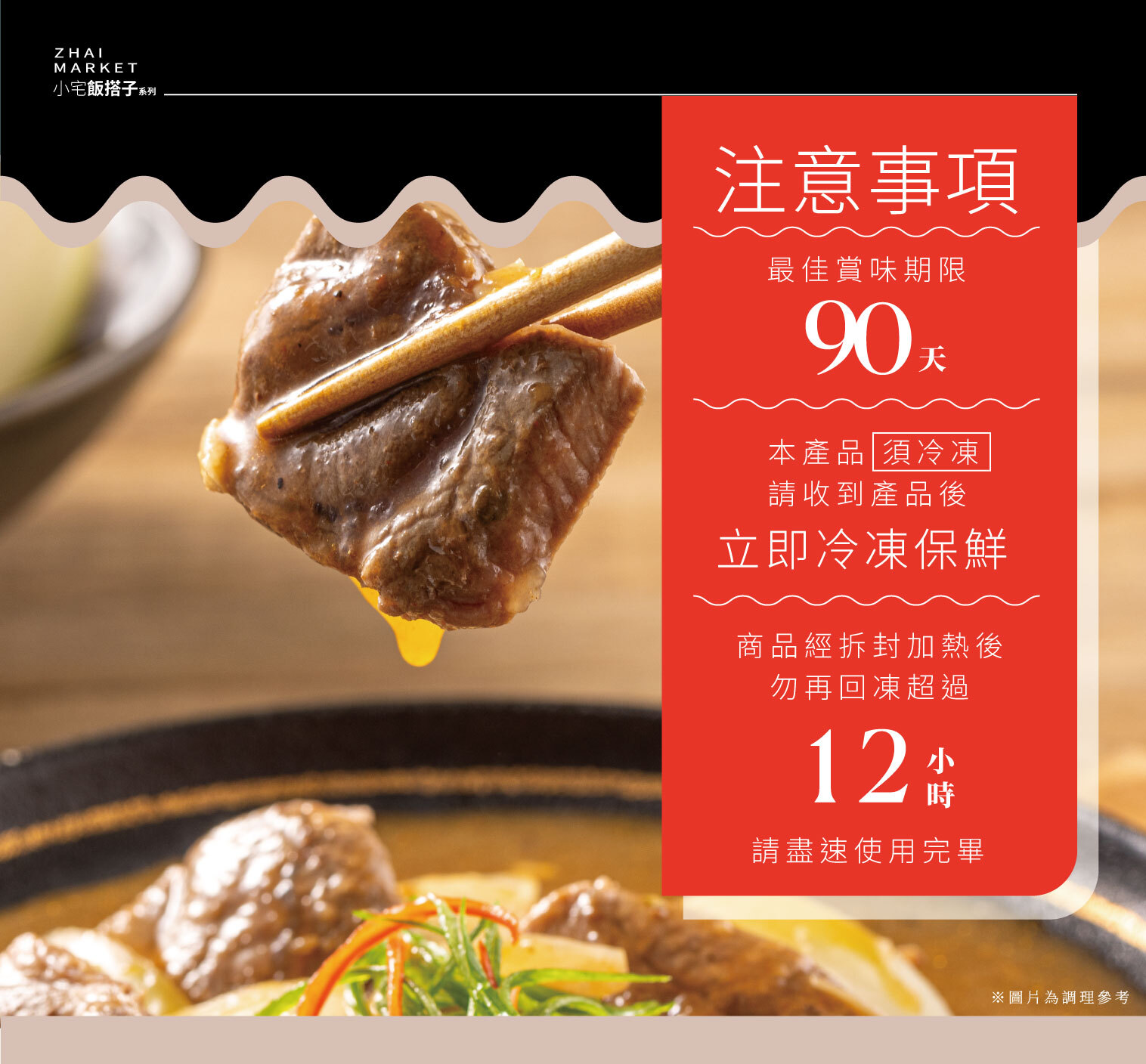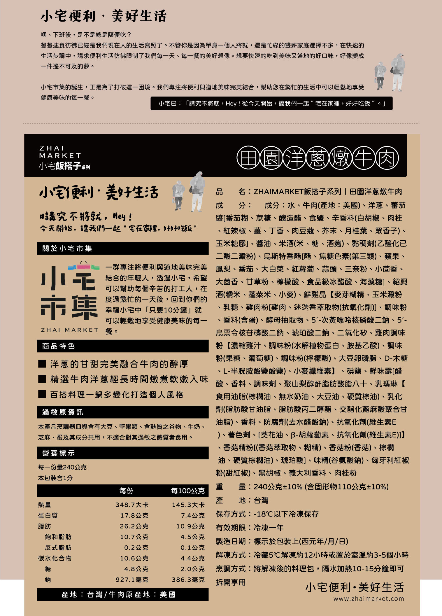 * 冷凍菜餚首選:冷凍真空包裝,鎖住鮮味與營養,最佳賞味90天,保存可達12個月 * 快速加熱上桌:只需微波或隔水加熱,10分鐘就能搞定美味主菜 * 家常風味暖心推薦:洋蔥燉出自然甜味,牛肉入味軟嫩,老少咸宜 * 多種搭配提案:配飯、拌麵、夾入麵包,人人都能變大廚,簡單變化出多種懶人料理 建議吃法| * 冷藏解凍:使用前一天放入冷藏解凍,隔天即可加熱即食 * 微波加熱:剪開包裝袋倒入容器,加入約2-3分鐘沸騰即可食用 * 隔水加熱:整包不拆袋,隔水加熱6-10分鐘不等即可拆封倒入容器食用 就是這麼簡單,小宅市集的冷凍菜餚調理包適合上班族、忙碌家庭、深夜嘴饞的你 一包在手,美味無憂! 產品資訊| 品 名: ZHAIMARKET飯搭子系列|田園洋蔥燉牛肉 成 分: 水、牛肉(產地:美國)、洋蔥、蕃茄醬[番茄糊、蔗糖、釀造醋、食鹽、辛香料(白胡椒、肉桂、紅辣椒、薑、丁香、肉豆蔻、芥末、月桂葉、眾香子)、玉米糖膠]、醬油、米酒(米、糖、酒麴)、黏稠劑(乙醯化已二酸二澱粉)、烏斯特香醋[醋、焦糖色素(第三類)、蘋果、鳳梨、番茄、大白菜、紅蘿蔔、蒜頭、三奈粉、小茴香、大茴香、甘草粉、檸檬酸、食品級冰醋酸、海藻糖]、紹興酒(糯米、蓬萊米、小麥)、鮮雞晶【麥芽糊精、玉米澱粉、乳糖、雞肉粉[雞肉、迷迭香萃取物(抗氧化劑)]、調味粉、香料(含蛋)、酵母抽取物、5΄-次黃嘌呤核磷酸二鈉、5΄-鳥票令核苷磷酸二鈉、琥珀酸二鈉、二氧化矽、雞肉調味粉【濃縮雞汁、調味粉(水解植物蛋白、胺基乙酸)、調味粉(果糖、葡萄糖)、調味粉(檸檬酸)、大豆卵磷脂、D-木糖、L-半胱胺酸鹽酸鹽)、小麥纖維素】、碘鹽、鮮味露[醋酸、香料、調味劑、聚山梨醇酐脂肪酸脂八十、乳瑪琳【食用油脂(棕櫚油、無水奶油、大豆油、硬質棕油)、乳化劑(脂肪酸甘油脂、脂肪酸丙二醇酯、交酯化蓖麻酸聚合甘油脂)、香料、防腐劑(去水醋酸鈉)、抗氧化劑(維生素E )、著色劑、[葵花油、β-胡蘿蔔素、抗氧化劑(維生素E)]】、香菇精粉[(香菇萃取物、糊精)、香菇粉(香菇)、棕櫚 油、硬質棕櫚油)、琥珀酸]、味精(谷氨酸鈉)、匈牙利紅椒粉(甜紅椒)、黑胡椒、義大利香料、肉桂粉 重 量:240公克±10% (含固形物110公克±10%) 產 地:台灣 保存方式:-18℃以下冷凍保存 有效期限:冷凍12個月 製造日期:標示於包裝上(實際效期依照出貨包裝上為主) 解凍方式:冷藏5℃解凍約12小時或置於室溫約3-5個小時 烹調方式:將解凍後的料理包,隔水加熱10-15分鐘即可拆開享用 過敏原資訊:本產品烹調器皿與含有大豆、堅果類、含麩質之古物、牛奶、芝麻、蛋及其成分共用,不適合對其過敏之體質者食用。 委任製造廠商:慶鑫食品有限公司 聯繫電話:04-2336-0730 食品業者登錄字號:B-164100048-00000-2、B-164100048-00000-3 投保產品責任險字號:8513PDT00392 * 符合IOS 22000:2018、HACCP管理體系 備註| * 為配合物流規範,訂單金額如超過3500元,請與客服聯繫。 * 若有企業團購/大量訂購需求歡迎洽詢客服。 無論你愛喝湯或想吃辣,小宅市集冷凍菜餚系列都幫你準備好了。每一包冷凍湯品、即食料理,都為你省時、保留原味,是家中冰箱的必備即食糧! |