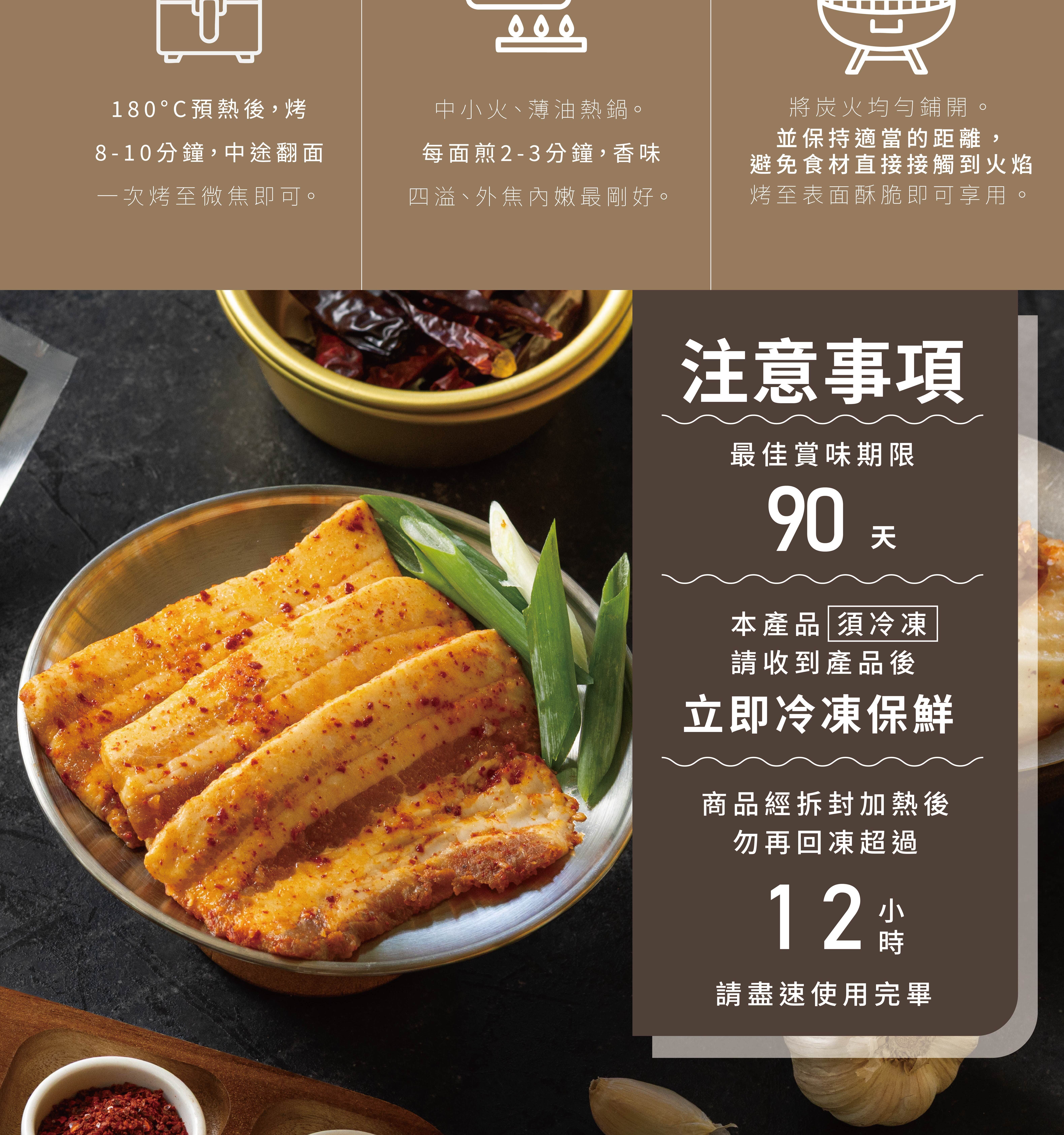 烹調方式:將解凍後的料理肉品拆封,加熱烤至焦香酥脆即可食用