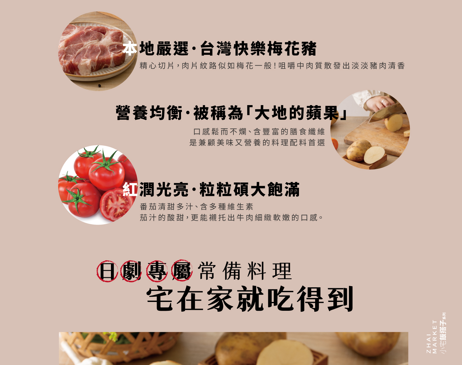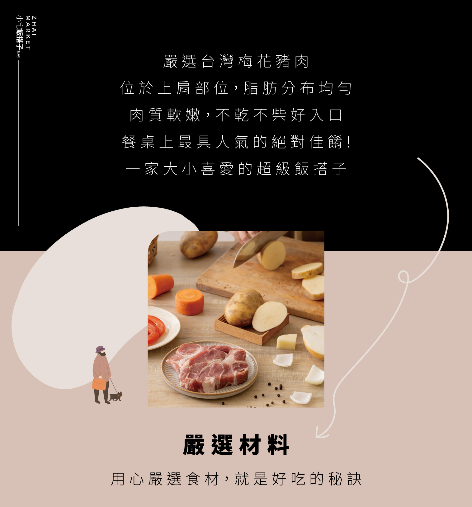 嚴選台灣梅花豬肉。位於上肩部位,脂肪分布均勻,肉質軟嫩,不乾不柴好入口!餐桌上最具人氣的絕對佳餚!一家大小喜愛的超級飯搭子